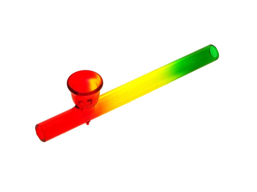 Skleněná fajfka dlouhá 10 cm vyrobená z kvalitního a tvrzeného borosilikátového skla zbarvené do rasta barev. Skleněná šlukovka je kromě toho ještě opatřena stojánkem, tzv. roll stoperem a tak pohodlně stojí na stole bez rizika skutálení.