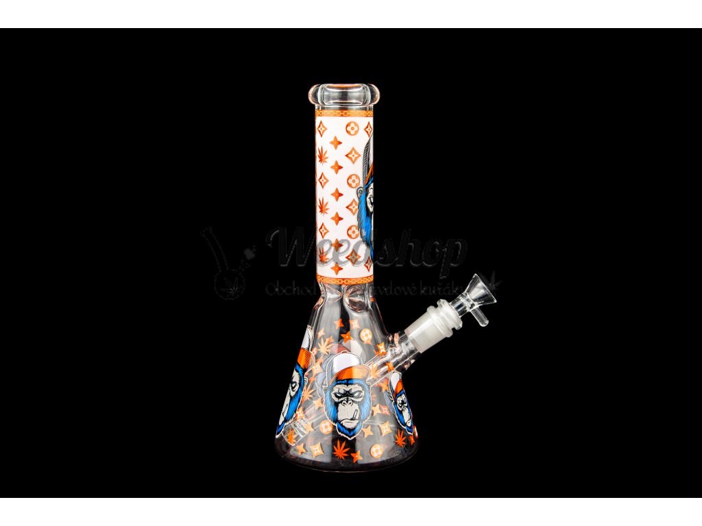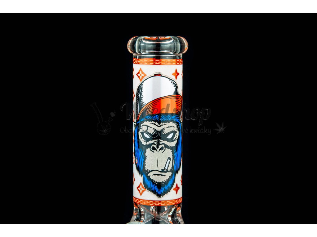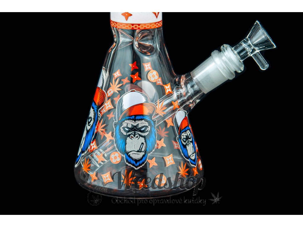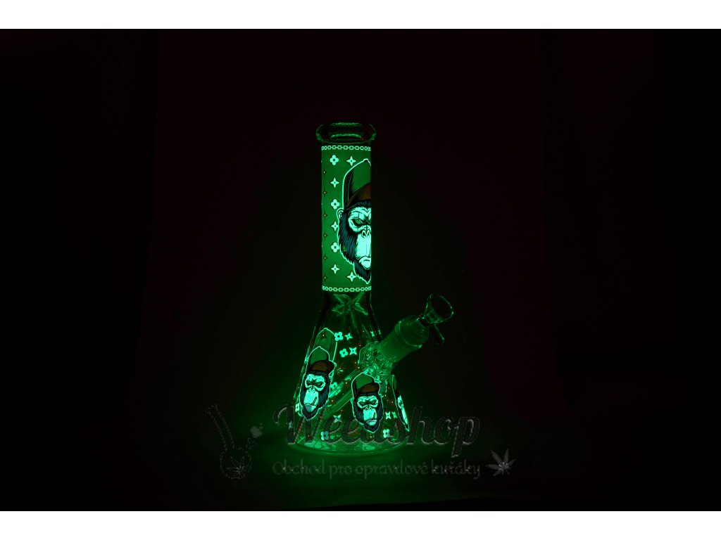 Skleněný bong, který svítí ve tmě s originálním motivem opice v oranžové barvě. Jedná se o skleněný bong, který je vysoký 25 cm a je vyroben ze zesíleného skla tl. 5 mm. I tak je potřeba pamatovat, že je to sklo a tak bong není nerozbitný. Díky zářezům lze bong plnit ledem. U bongu najdete kotel o rozměru 14,5 mm s praktickou úchytkou.